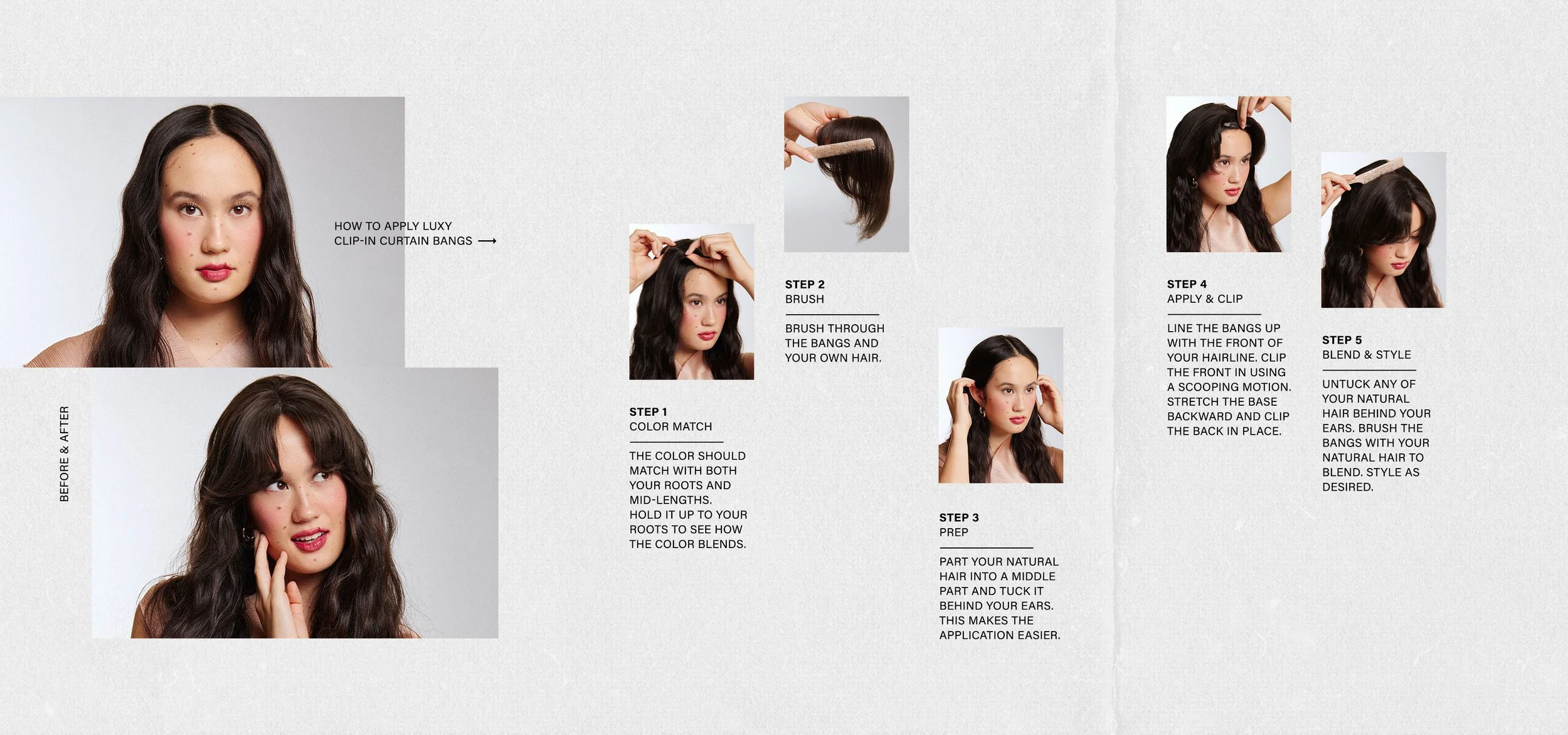 Educational imagery highlight the ease and transformation of Clip-In Bangs that blend seamlessly and come out just as easily.
